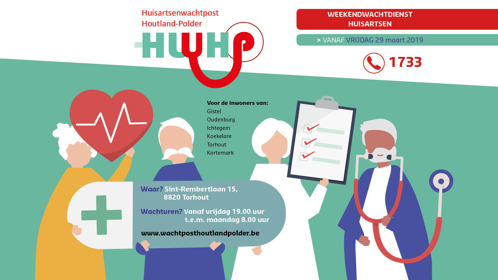 Op feestdagen en tijdens het weekend kan u voor dringende medische problemen steeds een beroep doen op de huisarts van wacht in de Huisartsenwachtpost Houtland-Polder (Sint-Rembertlaan 15, 8820 Torhout).